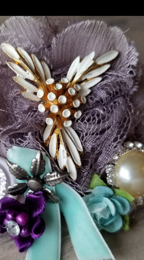 Accented with bits of white layered on purple and teal flowers. Pearls and jewels with a splash of velvet trim makes this piece unique.